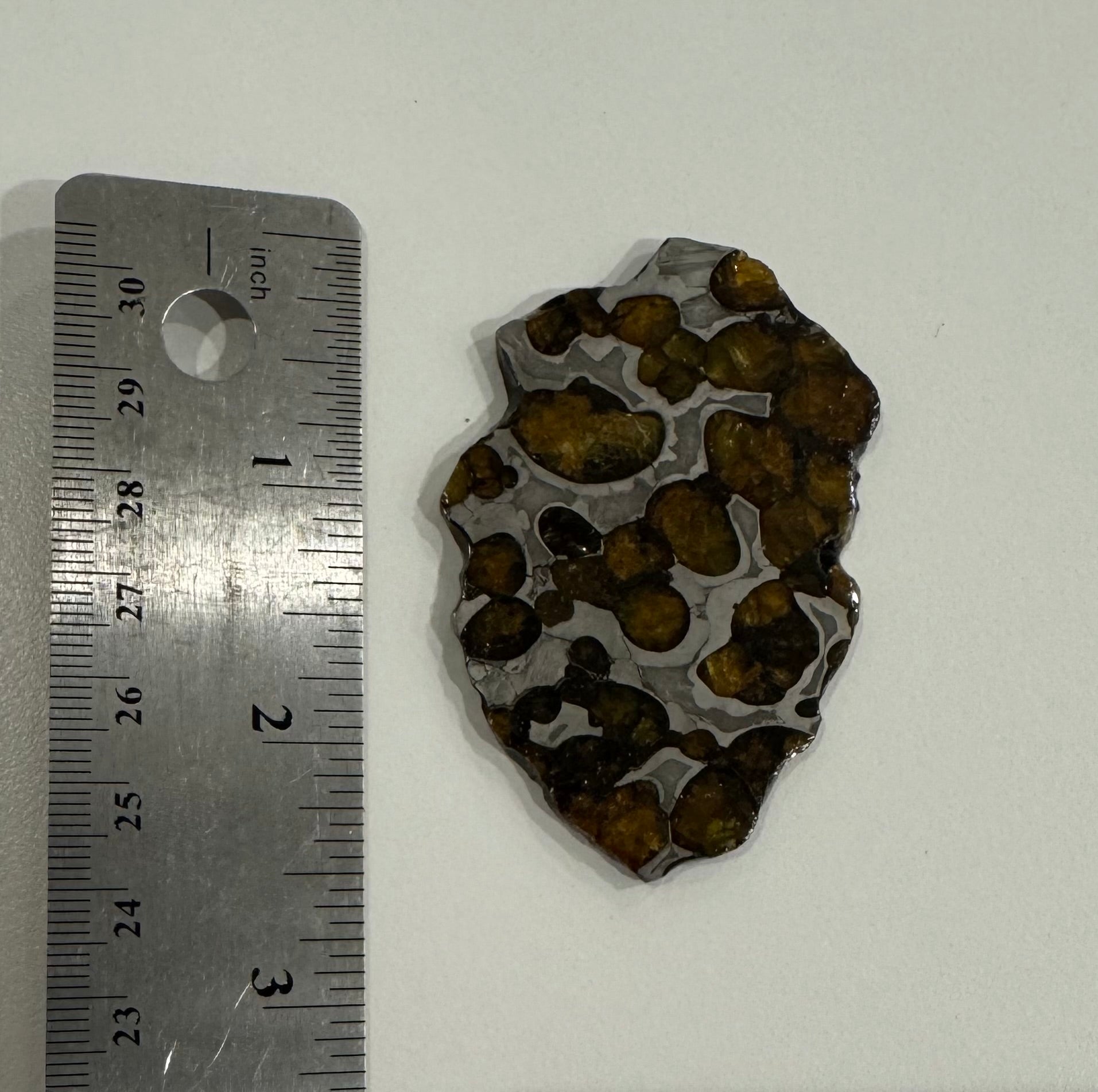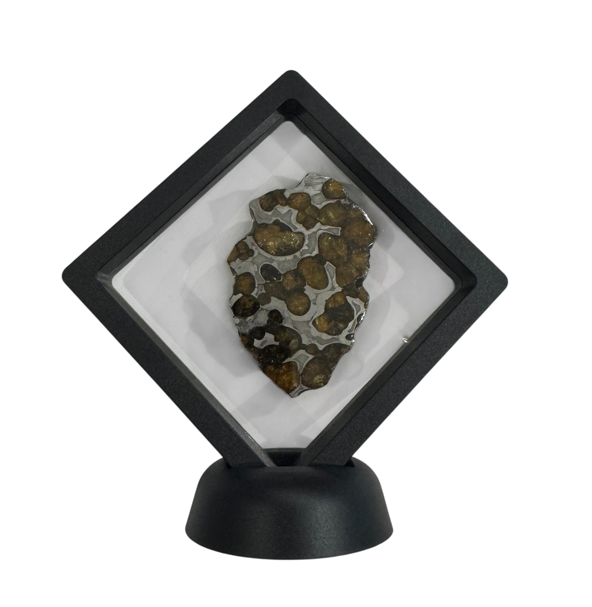 The olivine crystals are fragile, therefore the pallasite slice should be handled with care.