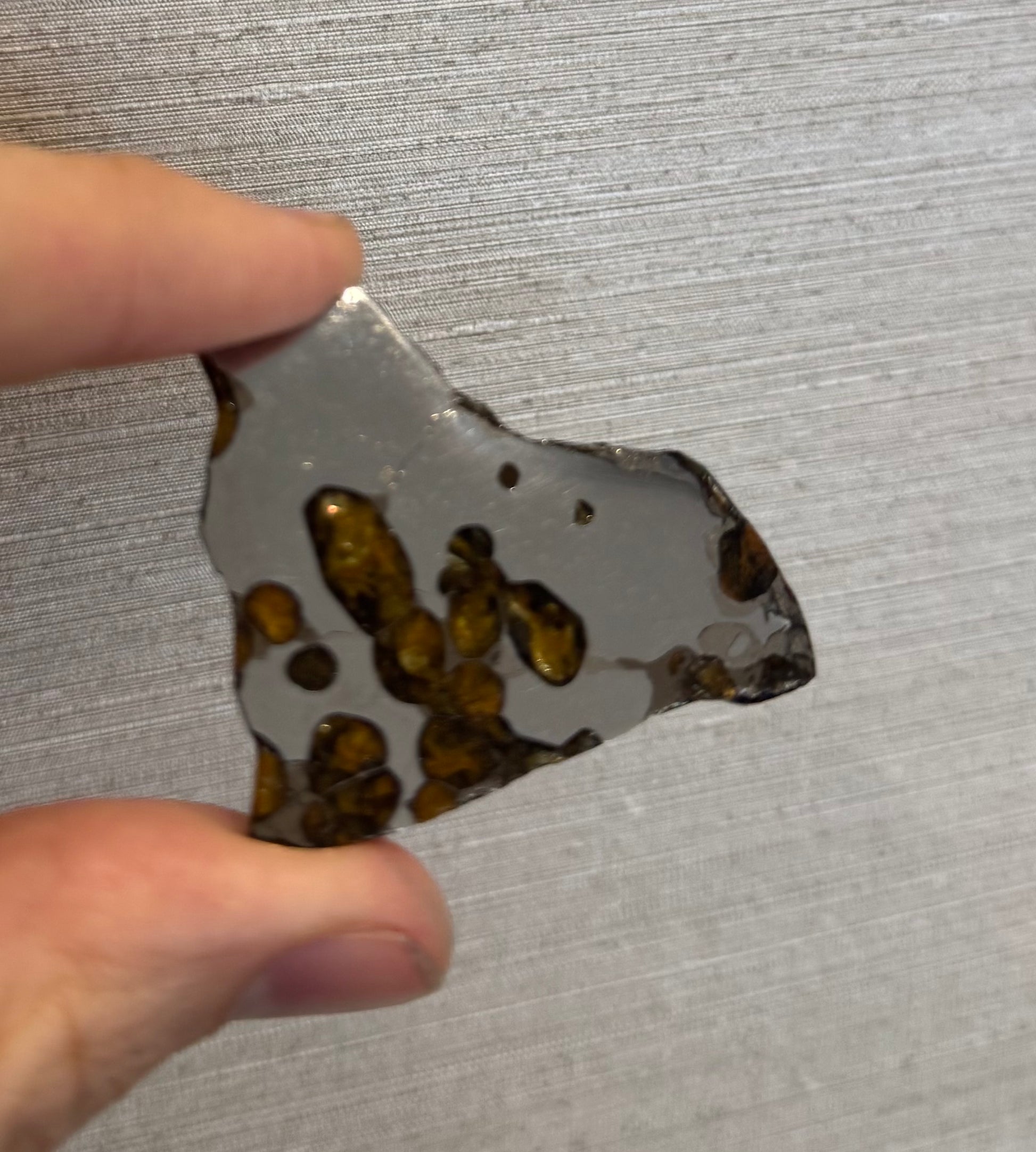 The olivine crystals are fragile, therefore the pallasite slice should be handled with care.