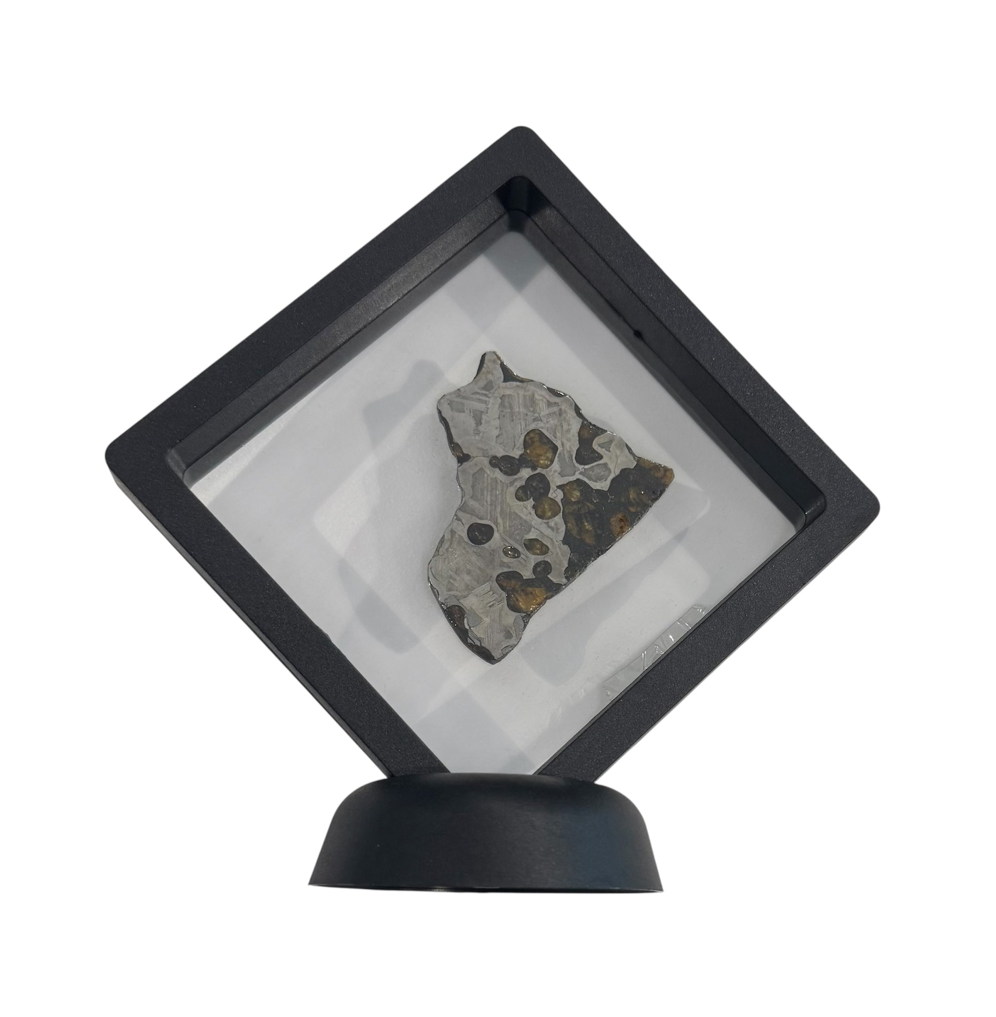 Hold a piece of the cosmos with this extraordinary Brenham pallasite slice. This remarkable specimen invites you to journey through space and time, making it an exquisite addition to your collection or a cherished gift for those fascinated by the mysteries of the universe. One side is etched to reveal the nickle-iron matrix, while the other is polished to a reflective sheen. Originating from the Brenham meteorite fall in Kansas, this pallasite slice is comprised of olivine crystals embedded in a metallic matrix, it's a prime example of the rare and enthralling stony-iron meteorite family, a true gem from space.