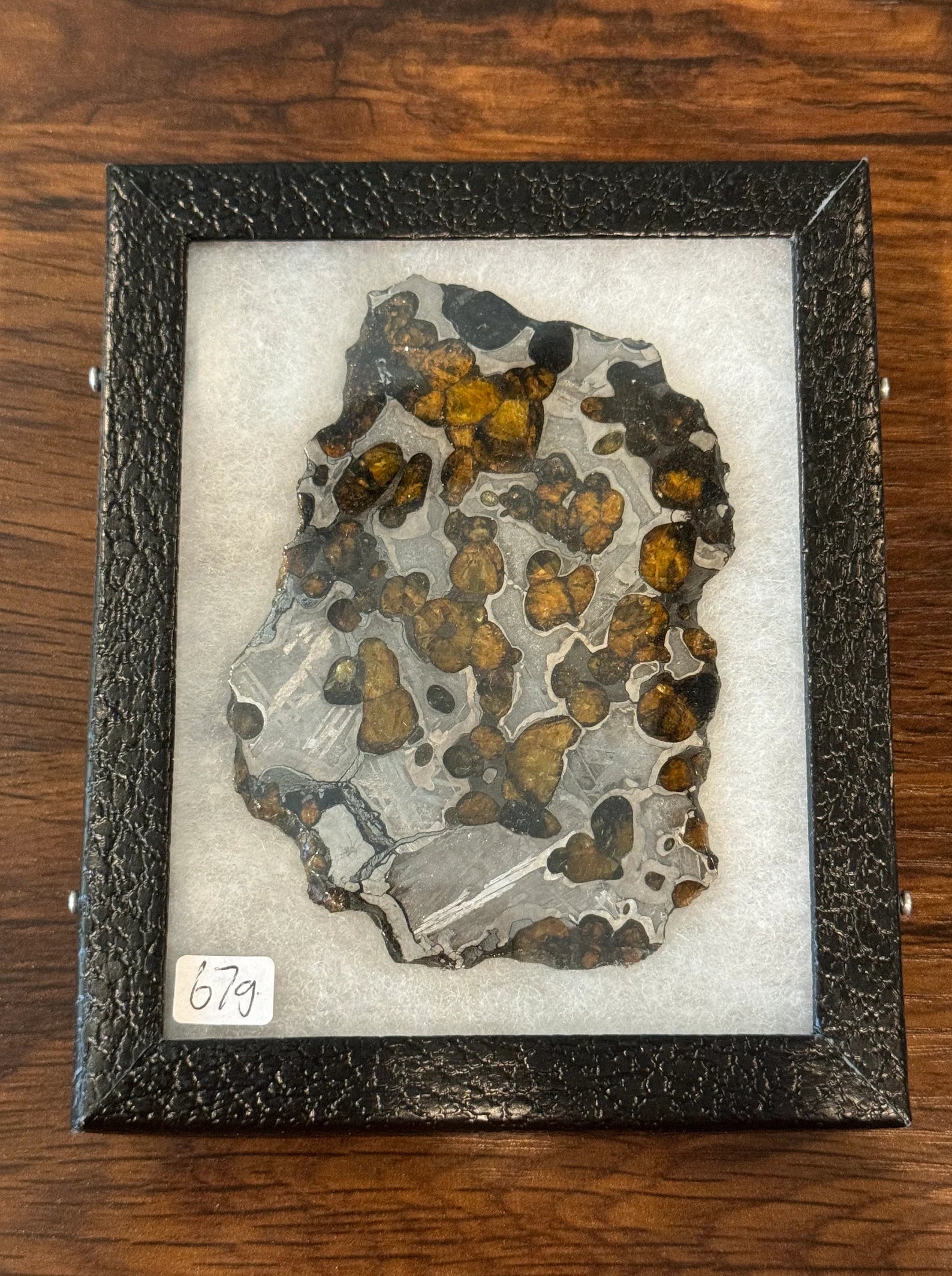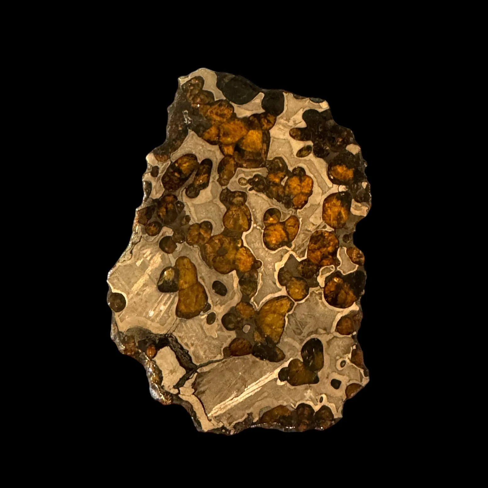 Hold a piece of the cosmos with this extraordinary Brenham pallasite slice. This remarkable specimen invites you to journey through space and time, making it an exquisite addition to your collection or a cherished gift for those fascinated by the mysteries of the universe. One side is etched to reveal the nickle-iron matrix, while the other is polished to a reflective sheen. Originating from the Brenham meteorite fall in Kansas, this pallasite slice is comprised of olivine crystals embedded in a metallic matrix, it's a prime example of the rare and enthralling stony-iron meteorite family, a true gem from space.