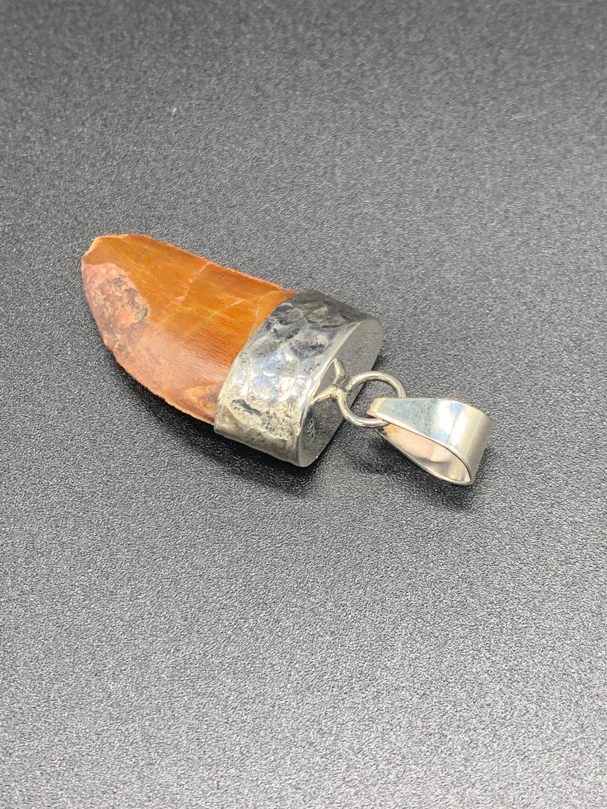 Elevate your style with this extraordinary pendant featuring a genuine Carcharodontosaurus tooth. Beautifully encased in sterling silver, this fossilized tooth is a striking fusion of prehistoric history and hand crafted artisanship.