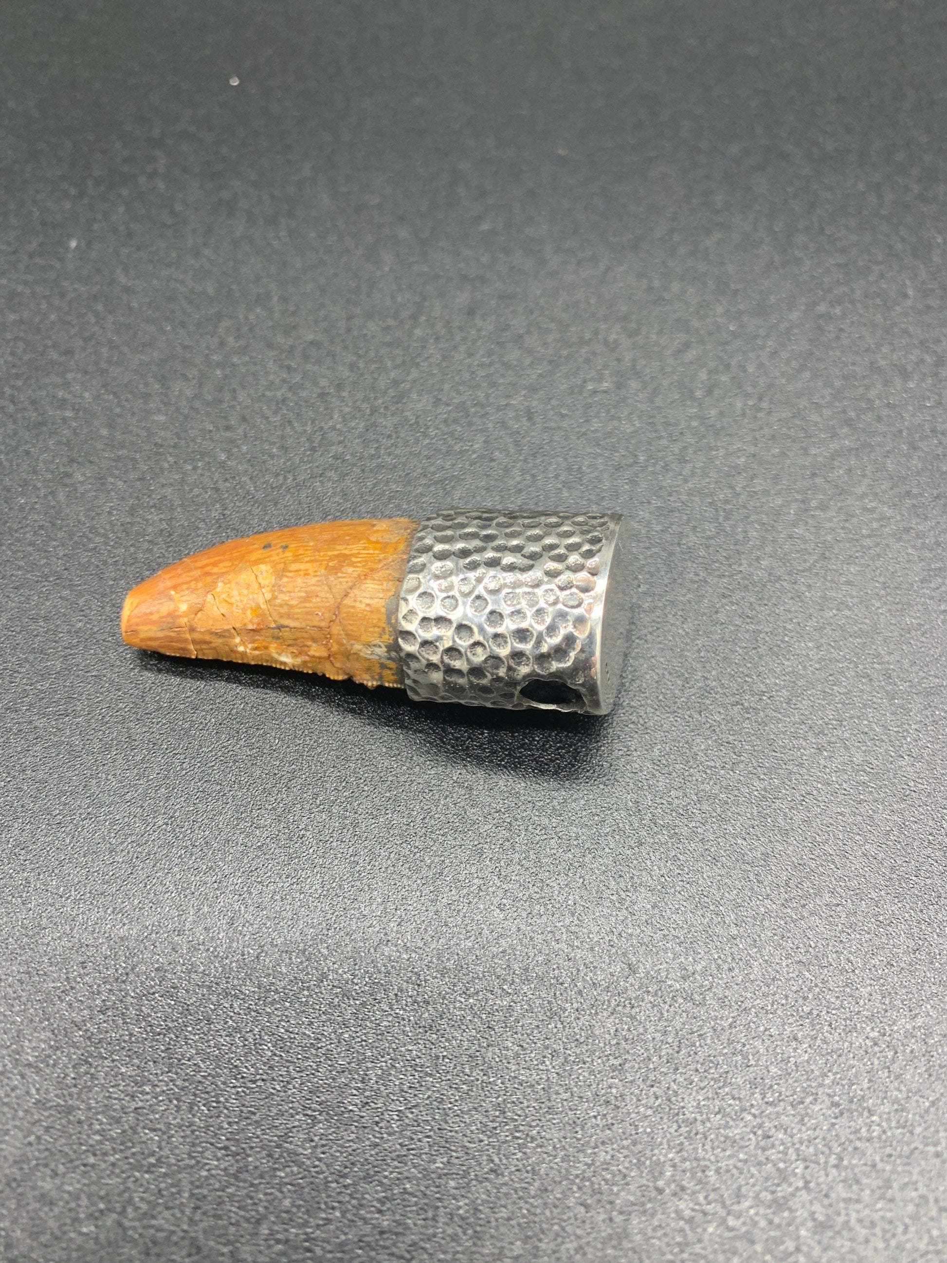 Elevate your style with this extraordinary pendant featuring a genuine Carcharodontosaurus tooth. Beautifully encased in sterling silver, this fossilized tooth is a striking fusion of prehistoric history and hand crafted artisanship.