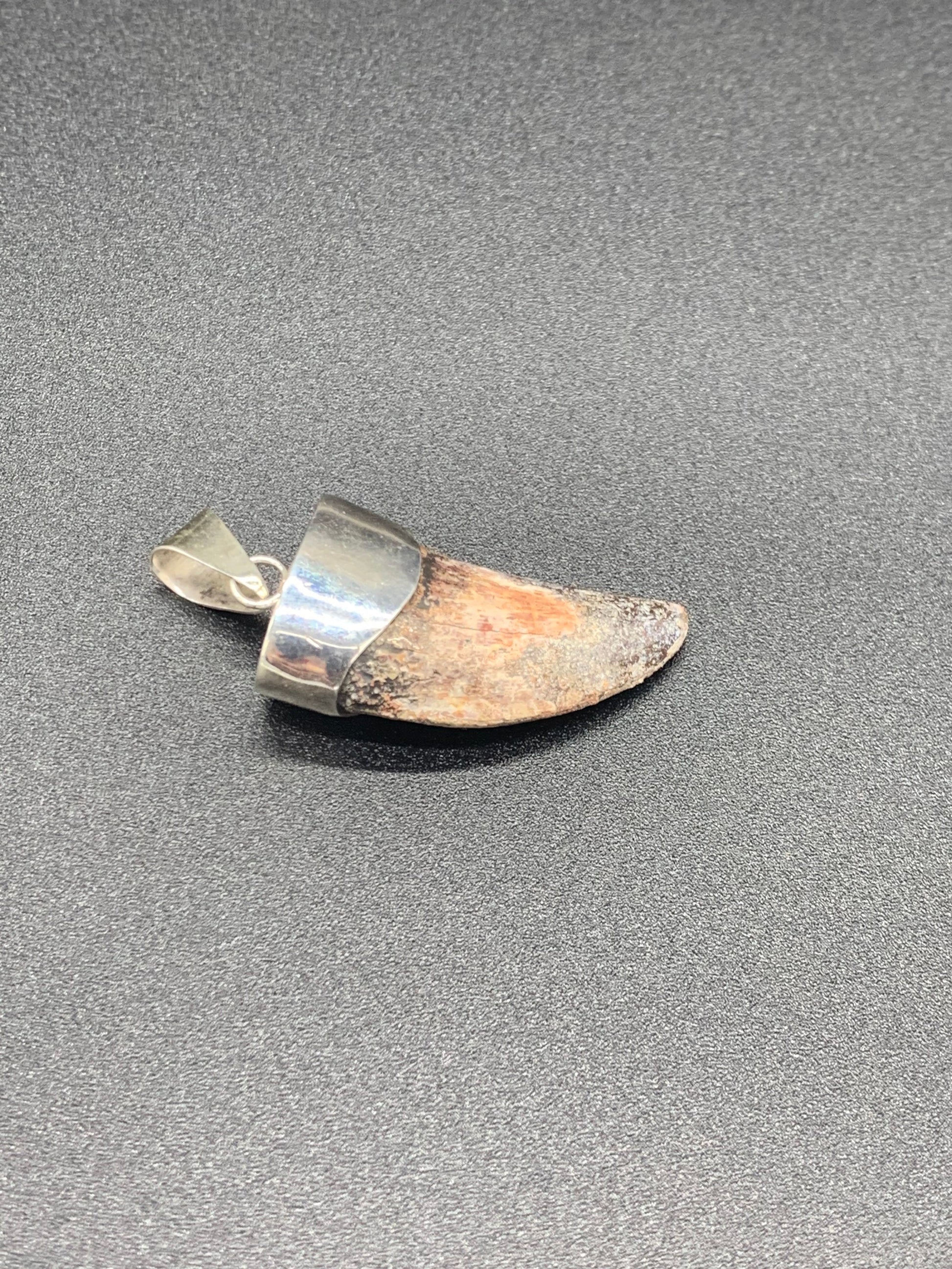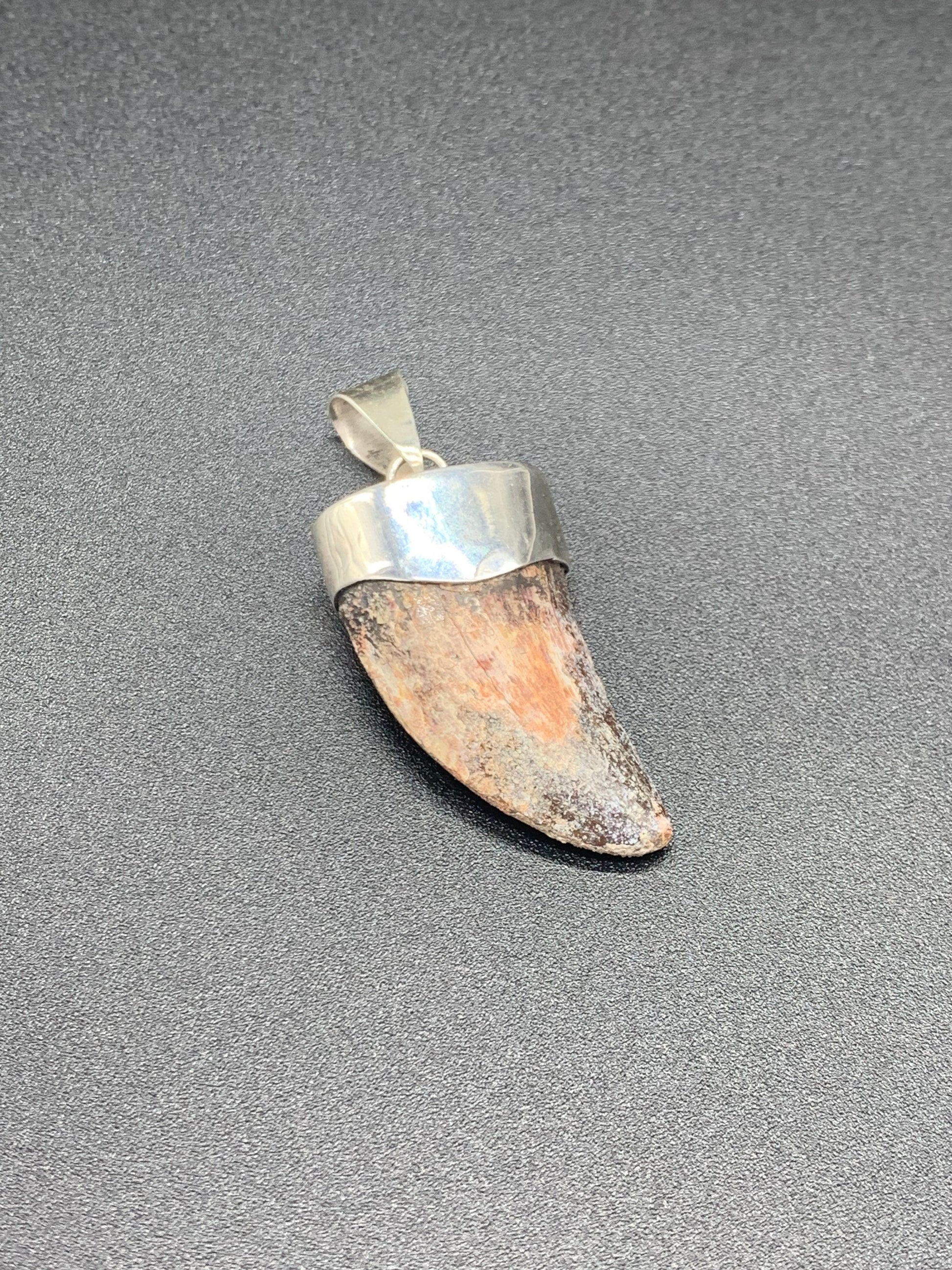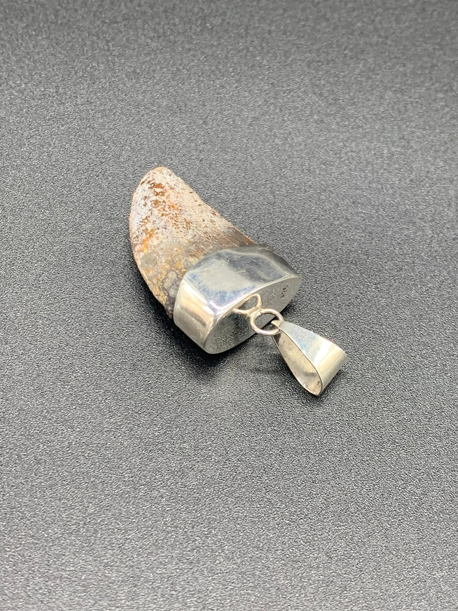 Elevate your style with this extraordinary pendant featuring a genuine Carcharodontosaurus tooth. Beautifully encased in sterling silver, this fossilized tooth is a striking fusion of prehistoric history and hand crafted artisanship.