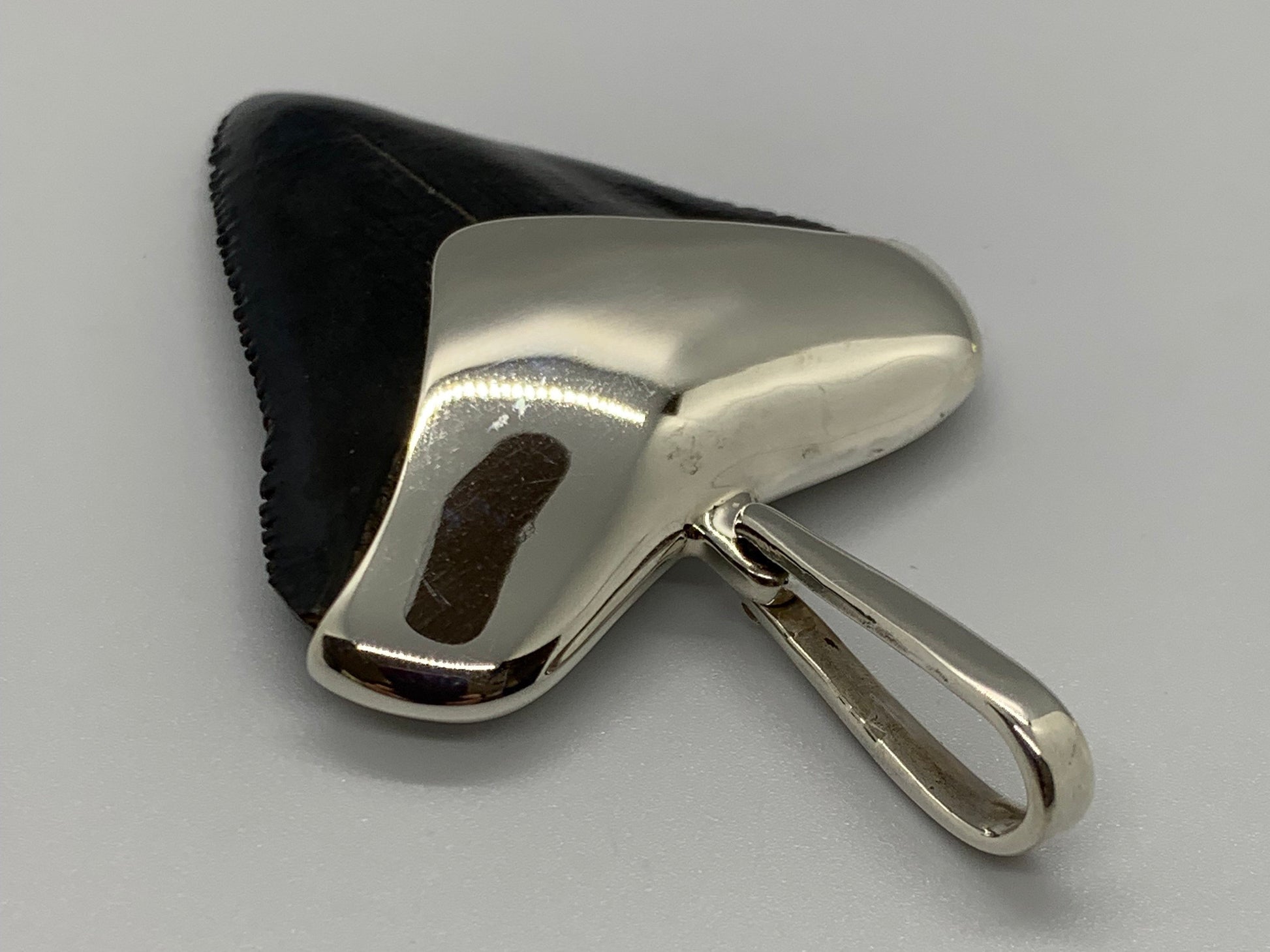 A gorgeous one of a kind Megalodon tooth pendant, exquisitely set on sterling silver. Medium size, chrome finishing.