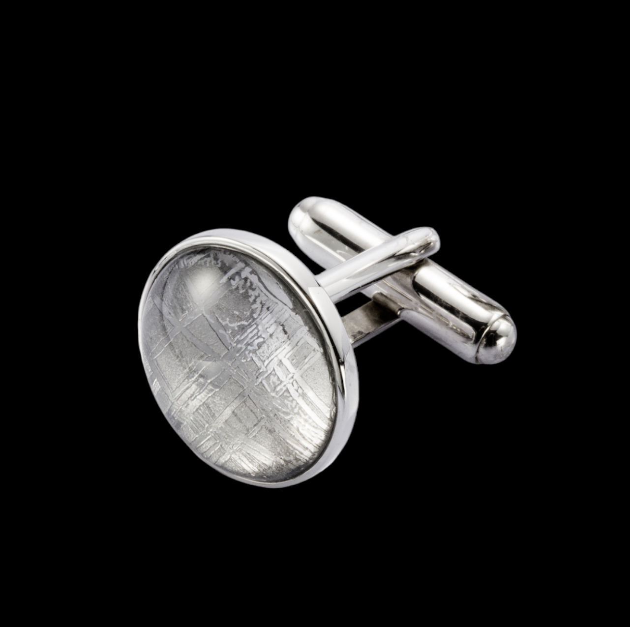 The Meteorite Round Cufflinks is crafted from the Muonionalusta meteorite, one of the oldest known meteorites, estimated to be over 4.5 billion years old. It was discovered in northern Sweden and is renowned for its distinctive Widmanstätten pattern, a unique crystalline structure formed by the slow cooling of iron and nickel in space. The Muonionalusta is protected by a quartz cap and is set in high-quality sterling silver, known for its durability and lustrous appearance. The sterling silver setting complements the natural beauty of the meteorite, enhancing its unique patterns and providing a sophisticated finish.