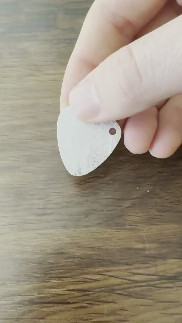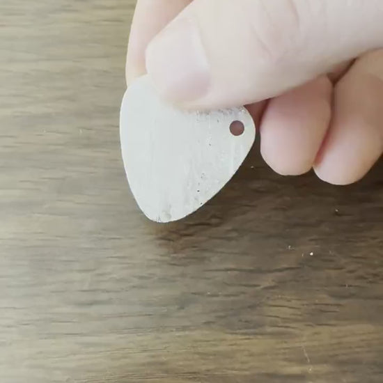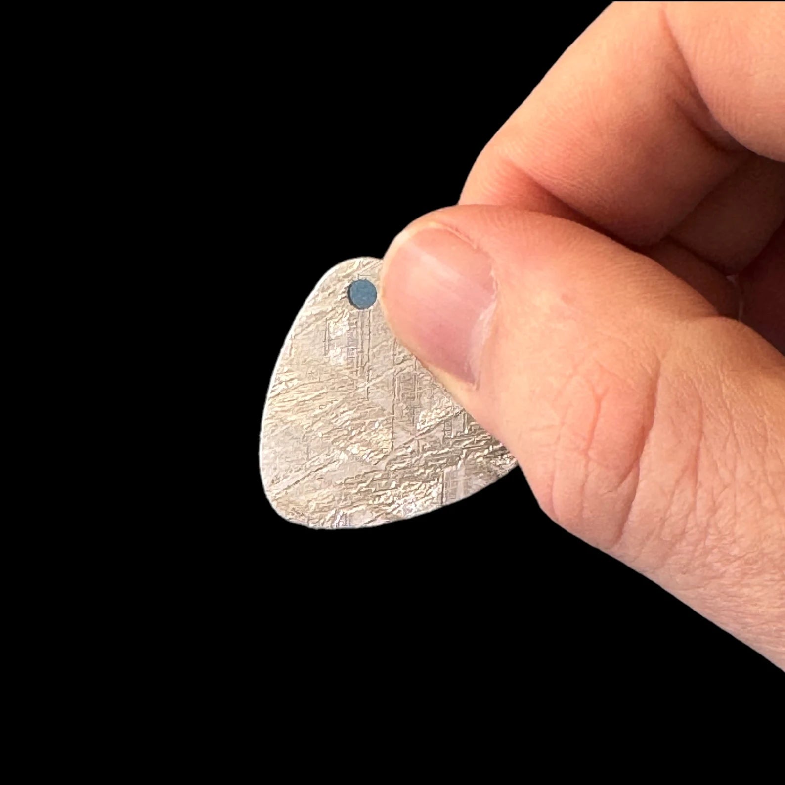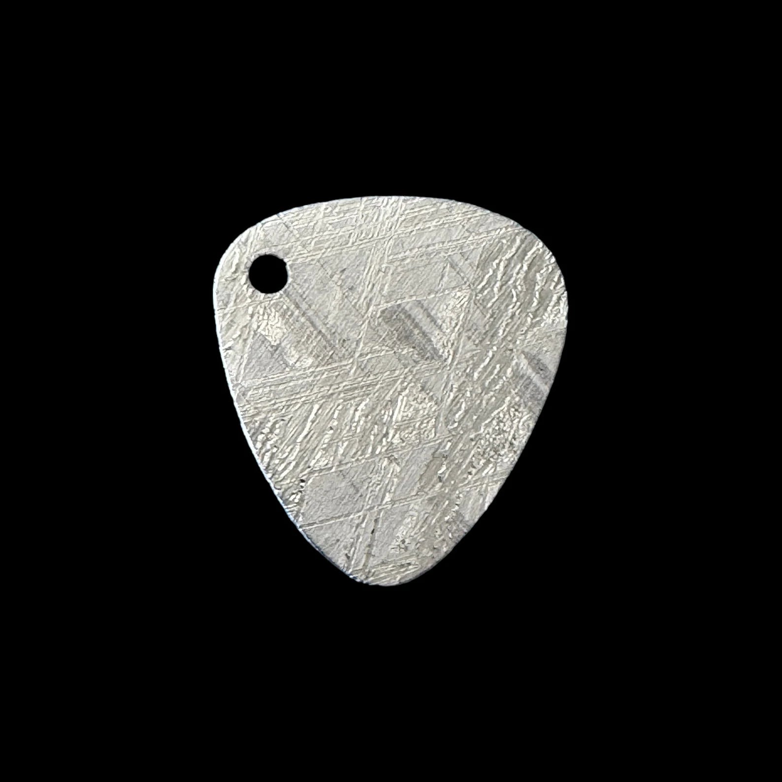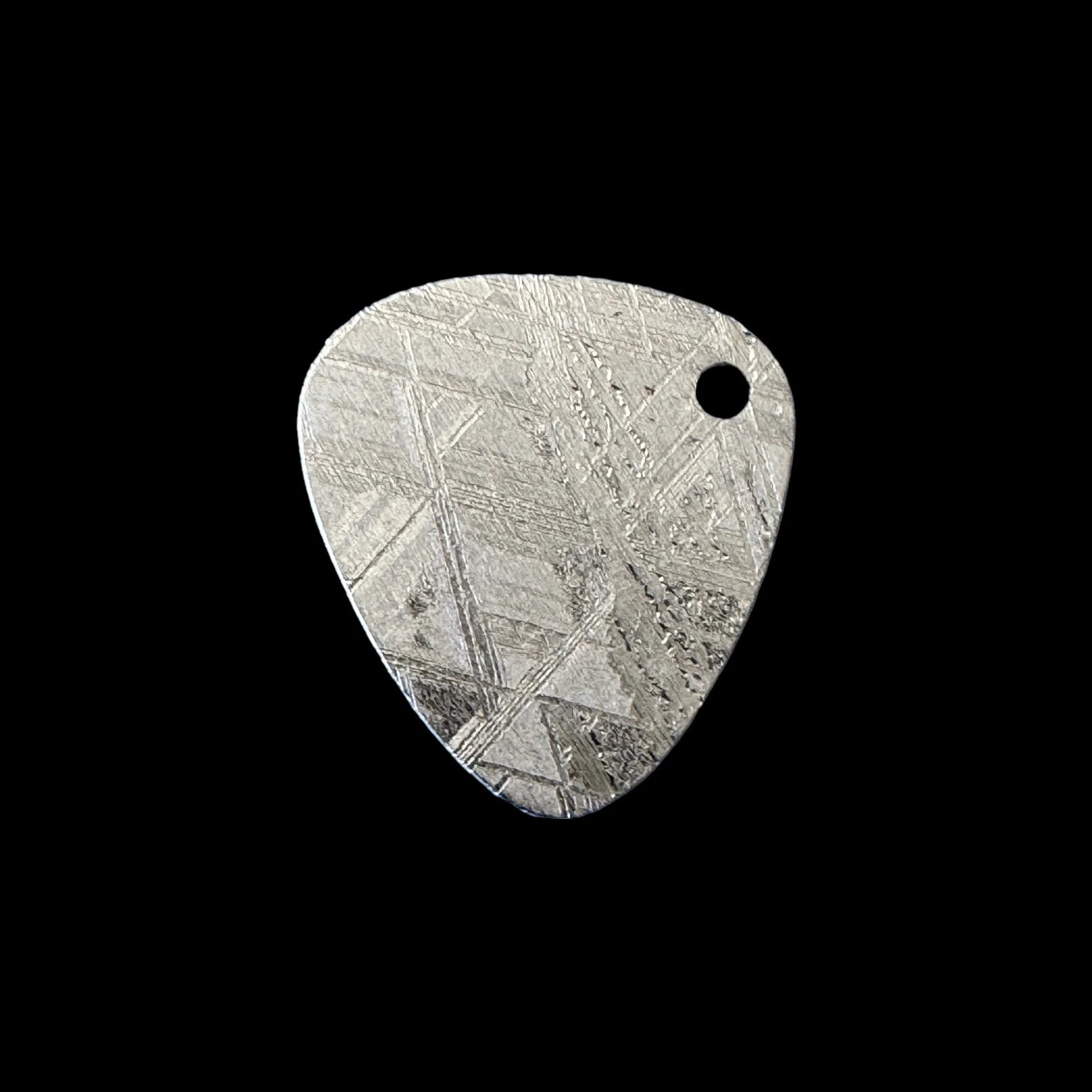 This Meteorite Guitar Pick is made from the renown Muonionalusta meteorite from Sweden. It features the Widmanstätten pattern, the iron nickel matrix intrinsic to the meteorite. There is a hole for making a pendent for music fashionistas. Because the material is mostly iron, be very gentle with nylon strings. This guitar pick is for easy strumming, not for guitar jam sessions. None the less, it is an essential for any space guitarist!