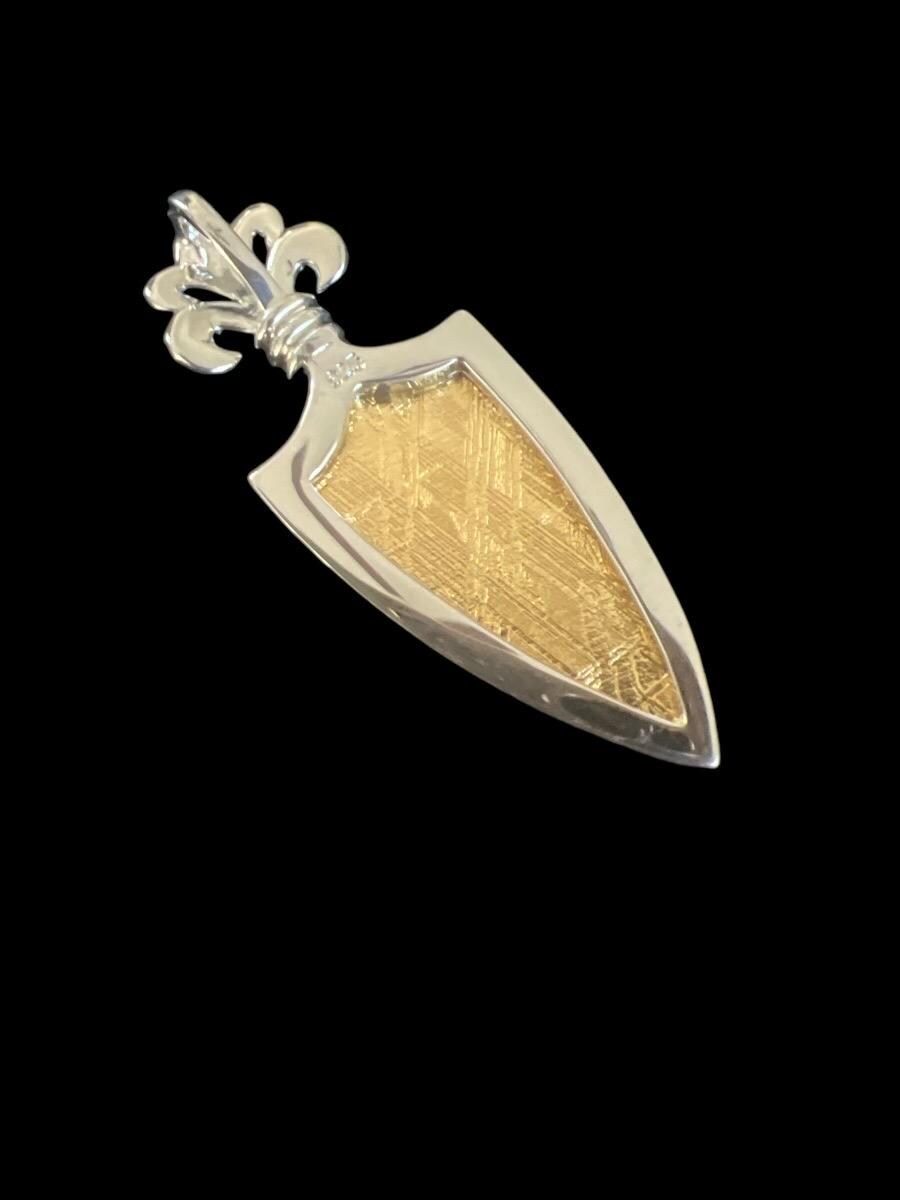 Celebrate the wonders of the cosmos with this exquisite shield-shaped Muonionalusta meteorite pendant. Expertly crafted, the meteorite is electroplated in gold and set in high-quality sterling silver, highlighting its distinctive Widmanstätten pattern—a unique crystalline structure formed over billions of years in the depths of space. The shield design embodies strength and protection, making it not only a stunning piece of jewelry but also a meaningful symbol.