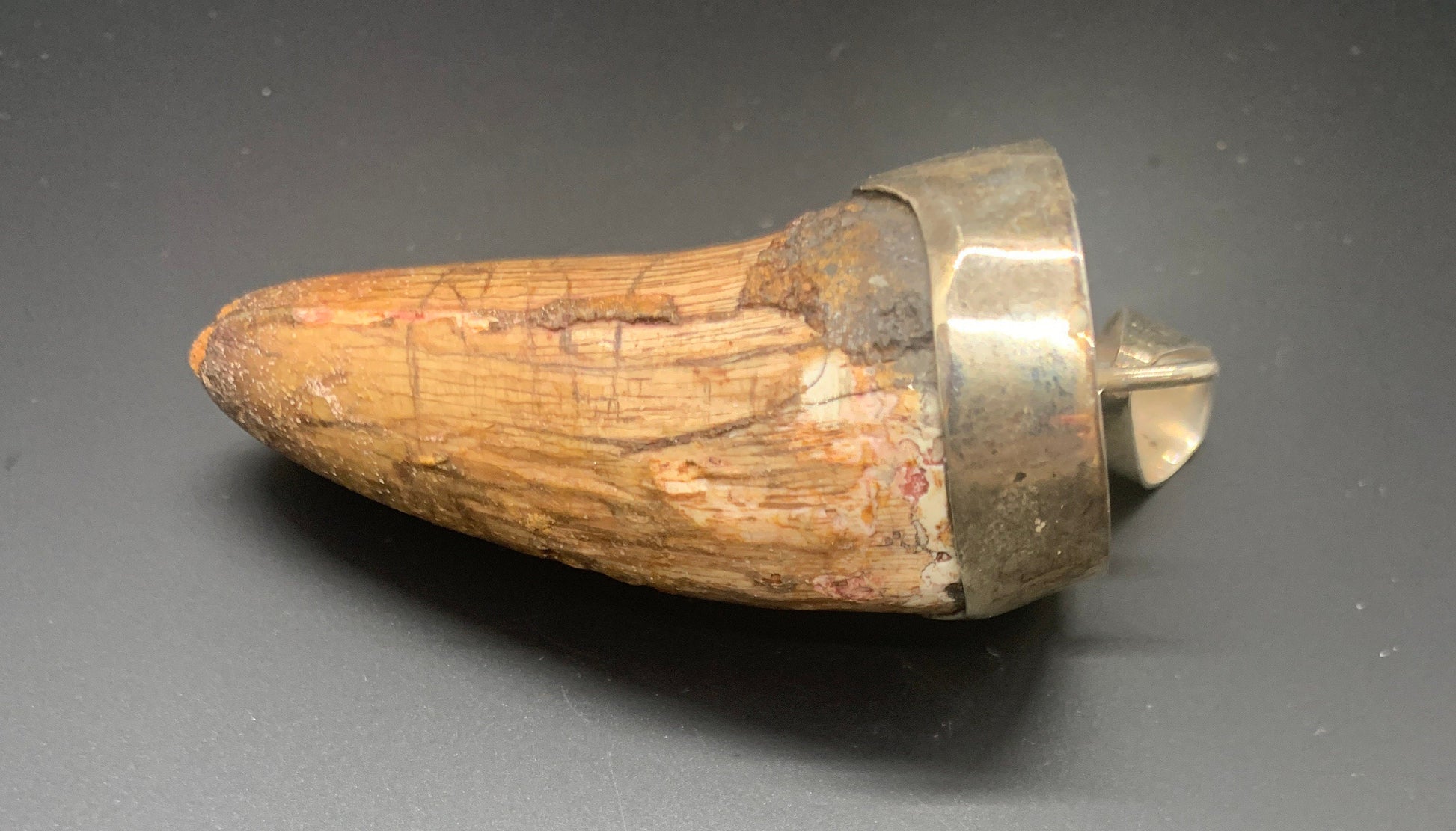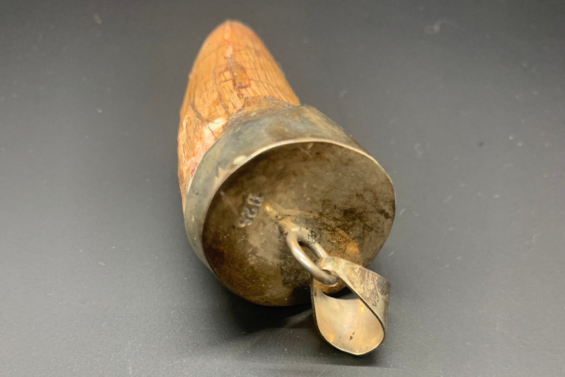 Discover a piece of ancient history with this captivating Spinosaurus tooth pendant, set in sterling silver. This unique fossil is a powerful reminder of the prehistoric world, combining natural history and handmade craftsmanship.