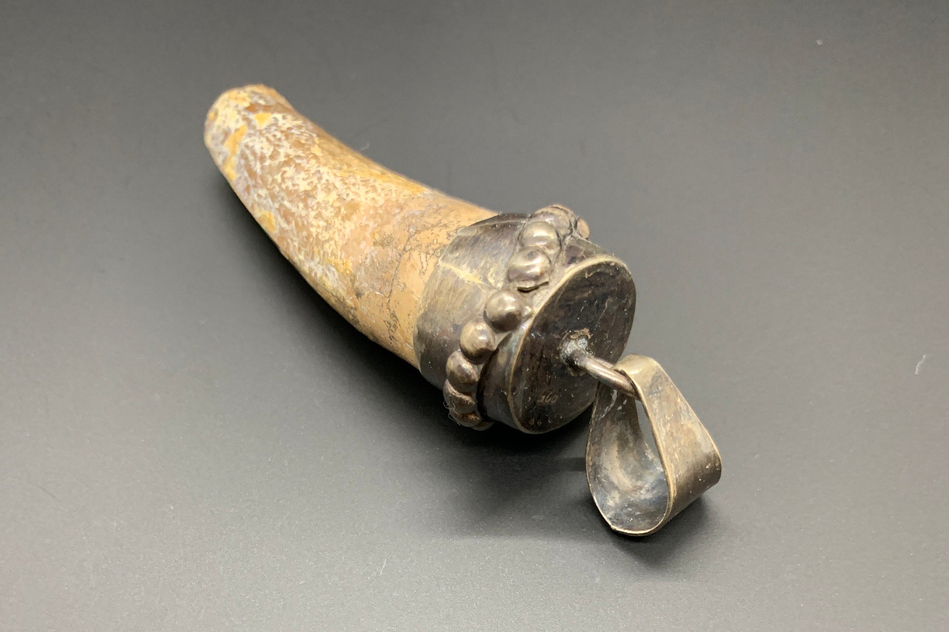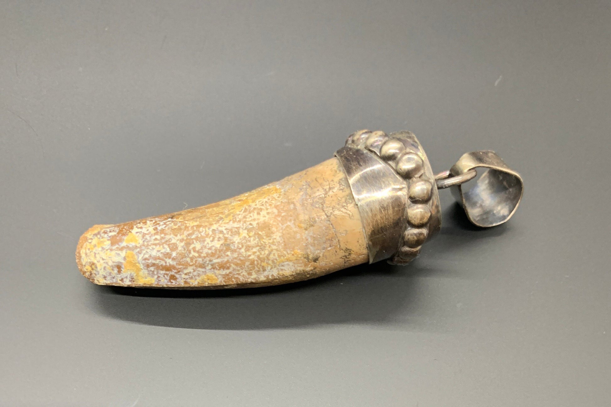 Discover a piece of ancient history with this captivating Spinosaurus tooth pendant, set in sterling silver. This unique fossil is a powerful reminder of the prehistoric world, combining natural history and handmade craftsmanship.